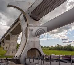 Parado em frente às maiores esculturas de. A roda de Falkirk ou Falkirk wheel é um elevador de barcos rotativo mais especificamente o trecho final do sistema de canais da Escócia que permite que barcos pequenos possam acessar dois canais - do trofeu Primeiro para o Estuário de Clyde construído pela Renovação dos canais Escócia. A diferença de nível entre os dois canais é de 24m.